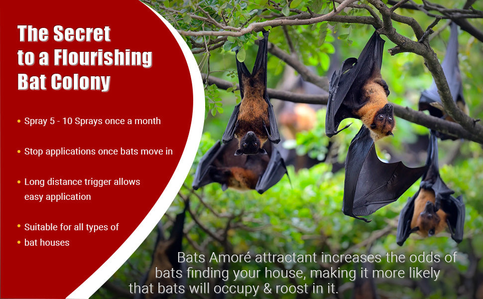 - BAT SPRAY TO IMPROVE ROOSTING: Bats Amore bat house spray utilizes the bat's responsiveness to smells and lures bats into bat houses. Using this bat attractant during the roosting season helps the bat find a new home, resulting in improved bat populations near human settlements.