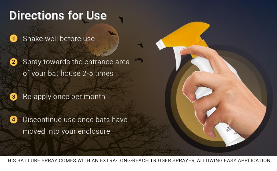 - SUPER EASY TO USE: This all-natural bat attractant comes in an 8-Oz long reach spray bottle. You only need to apply 5-10 sprays to your bat house once a month until the bats arrive and occupy it. This bat attractant is suitable for all types of bat houses, including chamber bat house & pole bat house.