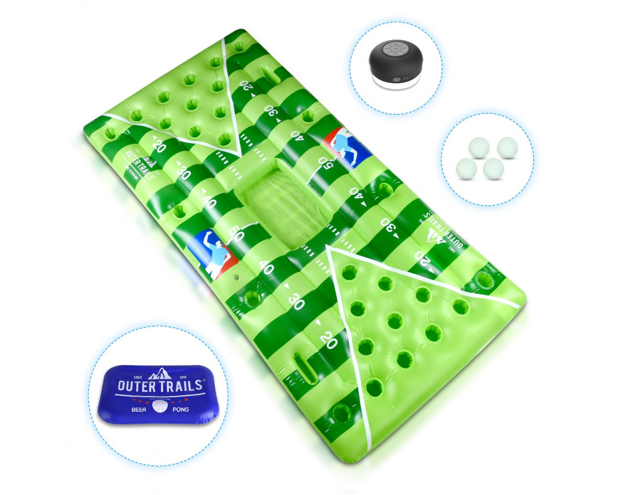 The Outer Trails Inflatable Beer Pong Table is unlike any other on the market. Our sleek design with vibrant colors is also reversible to double as a pool float with pillow. A necessary accessory to any pool for a fun relaxing weekend or a great party game. Comes with a cooler in the middle to hold extra drinks. A floating WiFi speaker comes with our beer pong table to add some music to the fun times.