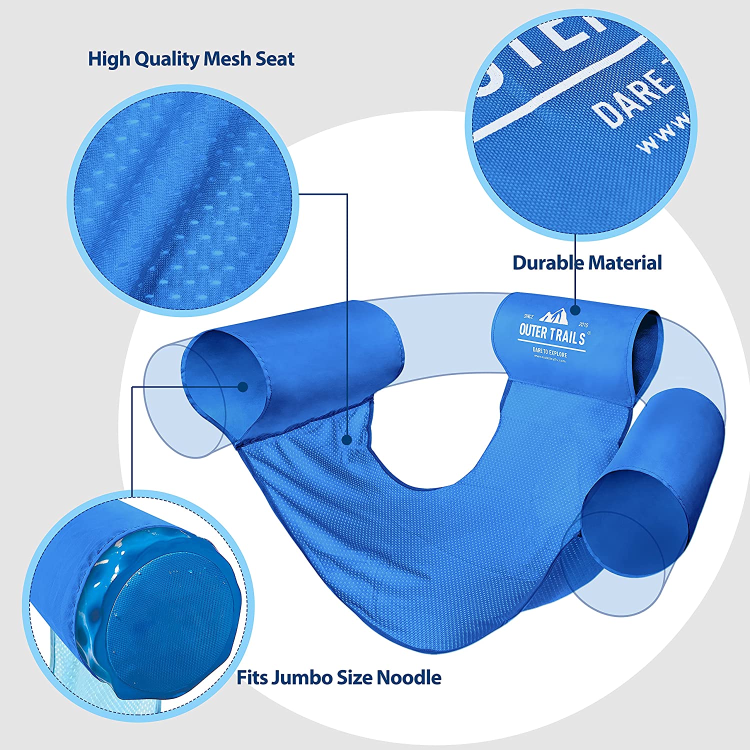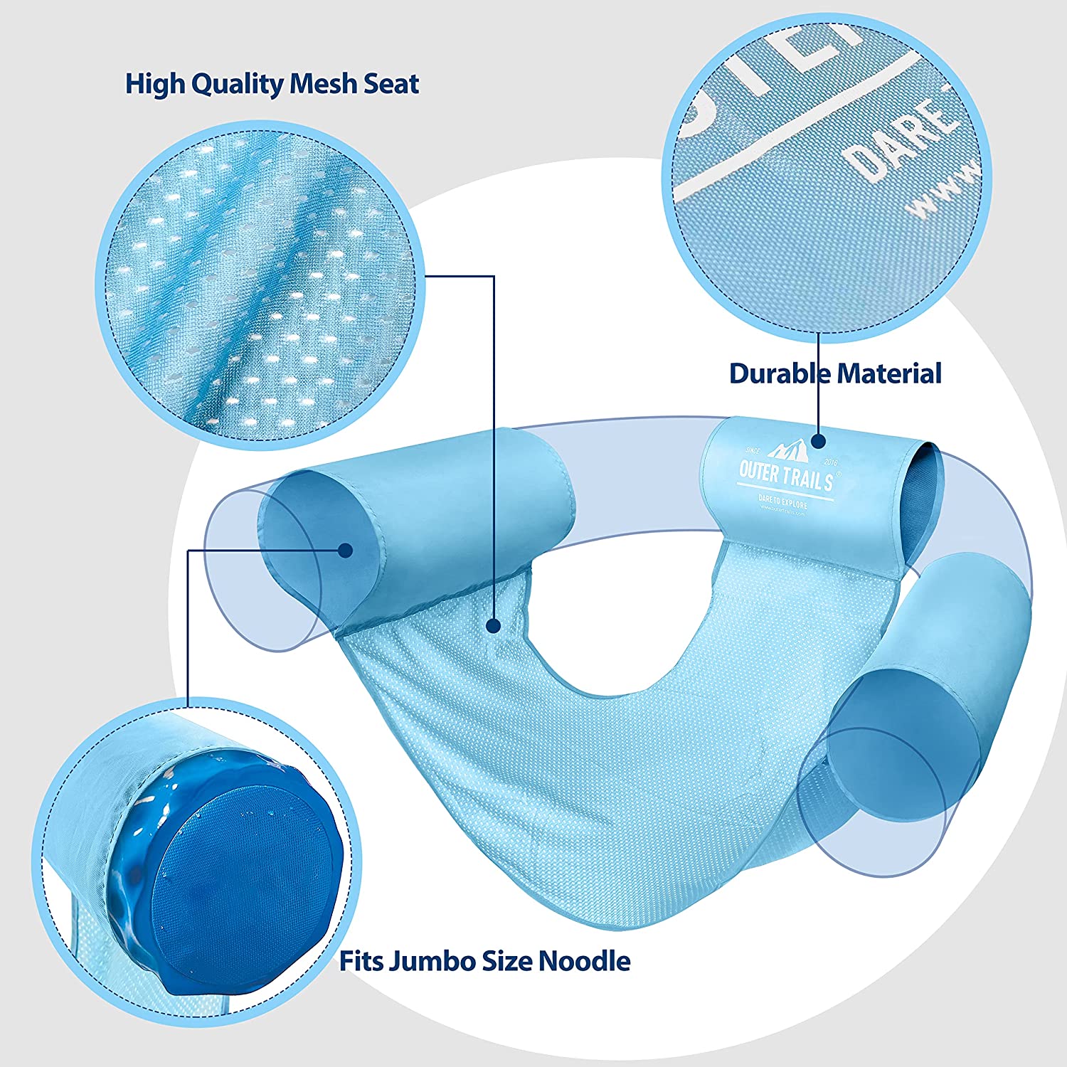 - Come in Light Blue and Dark Blue: top-quality fabric seats come in a range of bright colors and are designed to fit most pool noodles, offering complete relaxation in the pool.